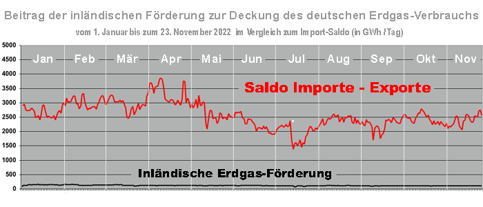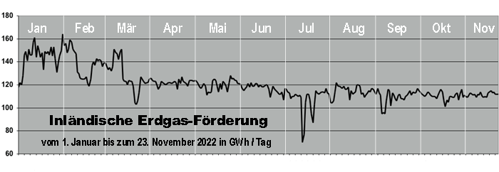 | Während die inländische Erdgas-Förderung in der Grafik oben den Eindruck eines scheinbar gleichbleibenden Sockels erweckt, macht diese Vergrößerung deutlich, dass sie kaum weniger schwankt als der Importsaldo. Bemerkenswert ist dabei, dass sie im ersten Quartal, als die Versorgung mit Importgas noch fast ungestört blieb, mit durchschnittlich 137 GWh/Tag besonders hoch war. Dagegen ging sie in der zweiten Jahreshälfte auf 110 GWh/Tag zurück, anstatt den Wegfall der russischen Lieferungen durch eine maximale Nutzung der inländischen Erdgasvorkommen wenigstens ein bißchen auszugleichen. |