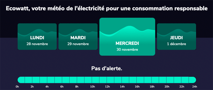 Hoffentlich bleibt alles grün: Falls die angezeigten Tage sich rot färben, müssen Haushalte, Unternehmen und Gemeinden in Frankreich ihren Verbrauch reduzieren, um Stromausfälle zu vermeiden. Genauere Angaben zu Zeitpunkt und Dauer der Stromknappheit sind der 24-Stunden-Leiste zu entnehmen. |