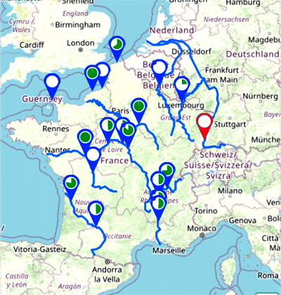 Die meisten französischen KKW-Standorte liefern derzeit deutlich weniger Strom als ihrer installierten Reaktor-Leistung entsprechen würde (grüne Sektoren). Seit der Stilllegung des KKW Fessenheim am Oberrhein (rot) gibt es noch 18 Standorte mit 56 Reaktoren und einer Nennleistung von 61,4 Gigawatt. Faktisch nutzbar sind in diesem Winter aber nur 40 Gigawatt. Quelle: nuclear-monitor.fr