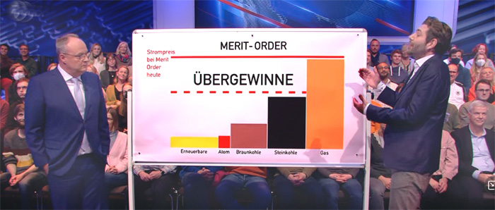 Die Ursache der gegenwärtigen Strompreisexplosion ist keineswegs ein allgemeiner Anstieg der Stromerzeugungskosten. Vielmehr ist sie in der bisherigen Gestaltung der "Merit Order" zu suchen, die den exorbitanten Kostenanstieg bei Gaskraftwerken mit vielfacher Verstärkung auf die Großhandelspreise durchschlagen lässt. Es wäre deshalb sinnvoller gewesen, erst mal die Strompreisbildung am Spotmarkt zu reformieren, anstatt nachträglich die stark überhöhten Strompreise per "Strompreisbremse" zu subventionieren und die in falschen Taschen gelandeten Übergewinne in nur sehr unzureichender Weise abzuschöpfen. – Das war die Botschaft, die in der satirischen "Heute-Show" des ZDF am 2. Dezember in allgemeinverständlichen Weise vermittelt wurde. Bei dem Reformvorschlag, den die beiden ZDF-Satiriker Klaus von Wagner (rechts) und Oliver Welke vorstellten, handelte es sich nicht etwa um einen Jux oder ein spinnertes Patentrezept, sondern um eine durchaus realistische Variante jener Strompreis-Deckelung, wie sie Spanien und Portugal schon im April dieses Jahres gegen den heftigen Widerstand von EU-Kommission, Stromerzeugern und Börsenkreisen durchsetzen konnten (220408). |