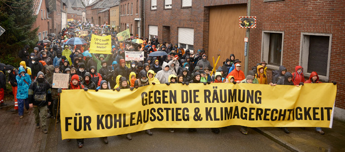 Am 11. Januar begann die Polizei damit, das von Klimaaktivisten besetzte Dorf Lützerath an der Abbruchkante des Braunkohletagebaus Garzweiler II zu räumen. Daraufhin kam es am 14. Januar zu einer Großdemonstration im benachbarten Dorf Keyenberg, an der sich nach Schätzung der Polizei rund 15.000 Menschen beteiligten. Die Veranstalter sprachen dagegen von mehr als 35.000 Teilnehmern. Aufgerufen hatten unter anderen der BUND und "Fridays for Future". Hauptrednerin bei der Kundgebung war die schwedische Klimaaktivistin Greta Thunberg.