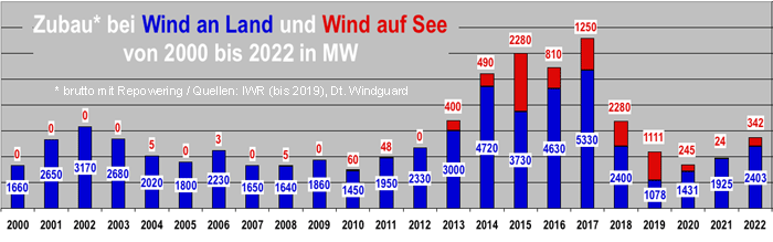 | Der Zubau bei Windkraft an Land (blau) übertrifft zwar die gesetzlichen Vorgaben für das Jahr 2022, müsste aber viel größer sein, um auch den neuen Anforderungen genügen zu können. |
