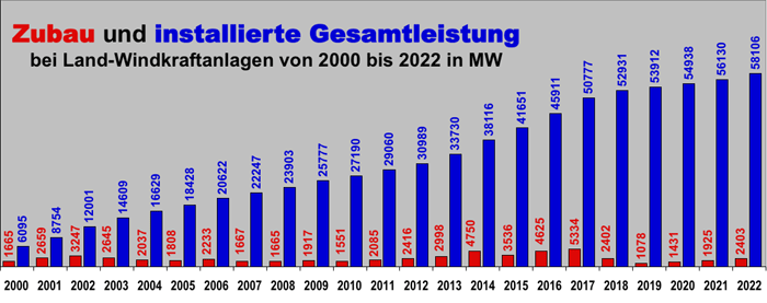 Der Zubau von Windkraftanlagen an Land, der 2019 einen Tiefpunkt erreichte, hat auch 2022 weiter zugenommen. Wie die Deutsche Windguard am 18. Januar mitteilte, wurden 2022 in Deutschland 551 Anlagen installiert, die zusammen über eine Leistung von 2.403 MW verfügen. Da gleichzeitig eine Kapazität von 266 MW zurückgebaut wurde, ergibt sich ein Netto-Zubau von 2.137 MW. Der kumulierte Bestand belief sich zum Jahresende auf 28.443 Windenergieanlagen mit einer Leistung von insgesamt 58.106 MW. Damit wurde das in § 4 des EEG 2021 gesetzte Ziel von 57 GW im Jahr 2022 sogar übertroffen. Der Zubau müsste indessen weit größer sein, um künftig auch die Vorgaben im EEG 2023 erfüllen zu können.