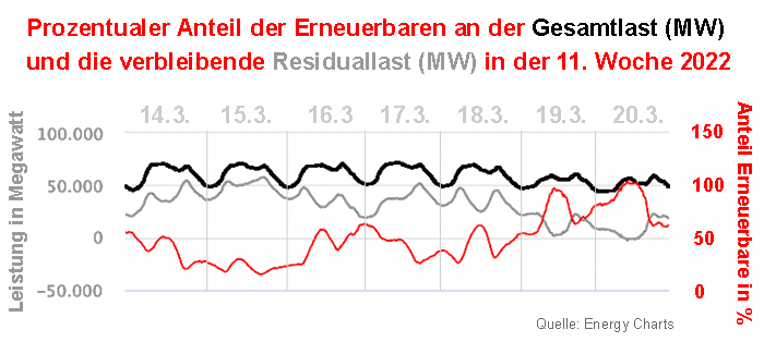 Am 20. März 2022, zwischen 13 und 14 Uhr, war einer jener bislang noch seltenen Momente, in denen der Strom aus erneuerbaren Energiequellen fast vollständig ausreichte, um den gesamten deutschen Stromverbrauch zu decken. In dieser Stunde betrug die Einspeisung der Erneuerbaren 53,3 GWh und die Netzlast 54,4 GWh. Dem nahezu hunderprozentigen Anteil der Erneuerbaren an der Gesamtlast von rund 50.000 MW entsprach dabei ein Absinken der Residuallast auf 0 MW. Dies war allerdings nur möglich, weil innerhalb dieser Stunde eine weiterhin sehr hohe Leistung von rund 17.000 MW an fossiler und nuklearer Stromerzeugung unter einem hohen Exportüberschuss von 15 GWh verbucht werden konnte (davon 3,1 GWh nach Österreich, 3,0 GWh nach Frankreich und 2,4 GWh nach Frankreich). Andernfalls wäre diese ins Ausland geflossene Strommenge als großteils nicht abbaubare Residuallast in der inländischen Strombilanz aufgetaucht und hätte dort die volle Nutzung des zur Verfügung stehenden Erneuerbaren-Stroms blockiert.