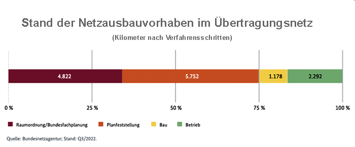 Von insgesamt 119 Netzausbauvorhaben mit einer Gesamtlänge von 14.044 Kilometern konnten bisher nur 23 Projekte mit einer Gesamtlänge von 2.292 Kilometer fertiggestellt werden