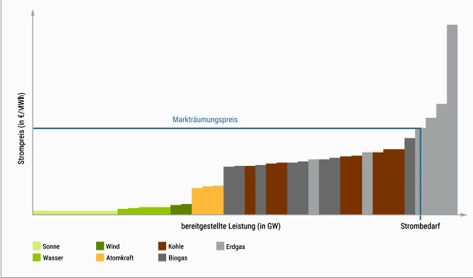 Zur Akzeptierung des Spotmarkt-Preises als allgemeiner Großhandelspreis kommt aber noch ein weiterer Umstand, der die besondere Brisanz der gegenwärtigen Preisexplosion überhaupt erst ausmachte: Dies ist der Mechanismus, nach dem die Preisbildung am Spotmarkt abläuft. Diese funktioniert nämlich so, dass die Gebote der Anbieter für den folgenden Tag (oder beim Intraday-Handel für denselben Tag) nach dem verlangten Preis pro Megawattstunde aufgelistet und dann in der Reihenfolge ihrer Preisgünstigkeit abgerufen werden, bis die Nachfrager ihren Bedarf gedeckt haben.