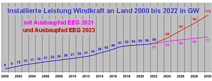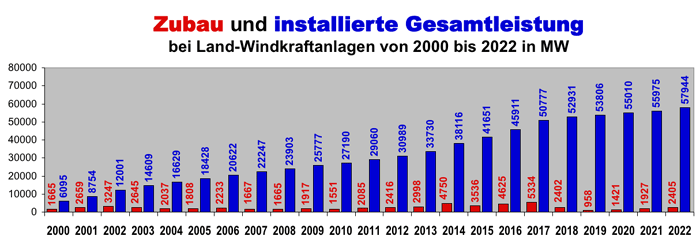 Den stärksten Zubau bei Windkraft an Land gab es bisher 2017 mit 5334 MW, den geringsten 2019 mit 958 MW. Die Erhöhung der Gesamtleistung aller Windkraftanlagen fällt immer etwas geringer aus als der Brutto-Zubau, da es sich oft um neue Anlagen handelt, die am selben Standort eine alte und weniger leistungsfähige Anlage ersetzen ("Repowering"). |