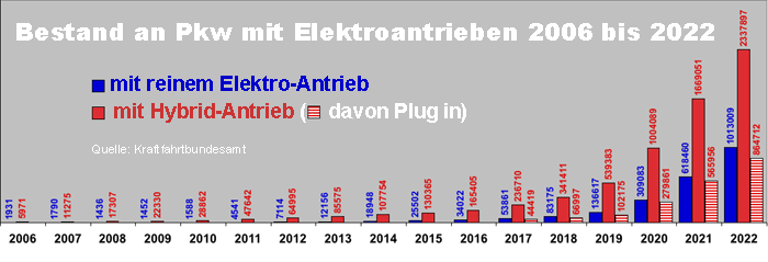 Nach dem anfangs sehr schwachen Interesse an der Kaufprämie (180102) gelang es so mit großem finanziellen Aufwand doch noch, den Anteil der reinen Elektroautos am Pkw-Bestand von 0,06 auf 2,1 Prozent zu erhöhen. Der innerhalb von sechseinhalb Jahren erzielte Zuwachs um rund eine Million ist aber noch immer viel zu wenig, um einen Bestand von "mindestens 15 Millionen vollelektrische Pkw bis 2030" zu erreichen, wie es sich die gegenwärtige Bundesregierung im Koalitionsvertrag zum Ziel genommen hat. Das würde voraussetzen, dass ab 2023 jedes Jahr im Durchschnitt mindestens 1,75 Millionen Elektroautos neu zugelassen werden.