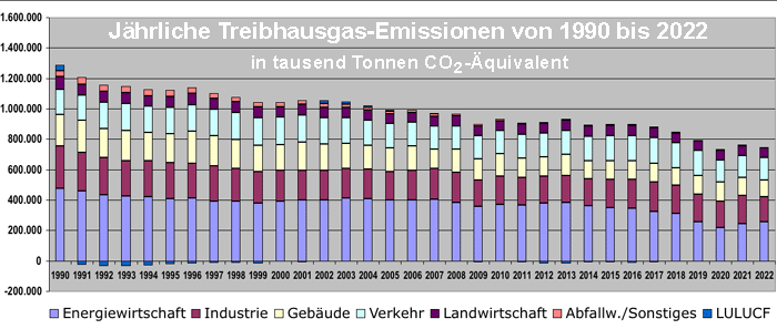 Wie das Bundesumweltamt am 15. März mitteilte, wurden im vergangenen Jahr in Deutschland rund 746 Millionen Tonnen Treibhausgase freigesetzt. Das sind knapp 15 Millionen Tonnen weniger als 2021, aber noch immer knapp 15 Millionen mehr als das bislang beste Ergebnis im Jahr 2020. Damals gingen infolge der Corona-Pandemie die Emissionen auf 731 Millionen Tonnen zurück. Nur dadurch wurde es dann auch möglich, das seit 2013 geltende und längst abgeschriebene Klimaschutzziel doch noch zu erreichen, die Emissionen bis 2020 um 40 Prozent gegenüber dem Referenzjahr 1990 zu senken (210104, 210309).