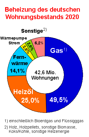 Von den rund 41 Millionen Haushalten in Deutschland heizt bisher nahezu jeder zweite mit Erdgas, gefolgt von Heizöl mit knapp 25 Prozent und Fernwärme mit gut 14 Prozent. Stromdirektheizungen und Wärmepumpen machen jeweils nicht einmal 3 Prozent aus. Die übrigen 6 Prozent entfallen auf Feuerungsanlagen für feste Brennstoffe wie Holz, Holzpellets, sonstige Biomasse und Kohle.