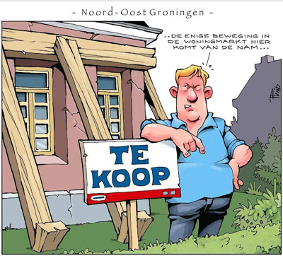 "Die einzige Bewegung auf dem Wohnungsmarkt hier kommt von der NAM", sinniert der Hauseigentümer, der auf dieser holländischen Karikatur mit dem Schild "Zu Verkaufen" vor seinem schwer beschädigten Gebäude steht. |