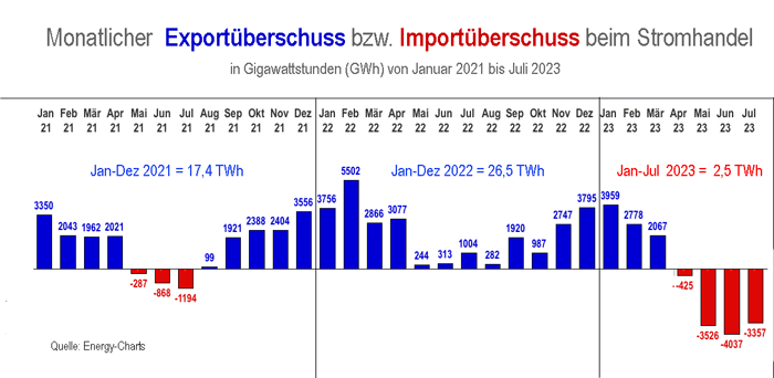 Schon 2021 gab es drei Monate lang einen Importüberschuss. Trotzdem verzeichnete man für das ganze Jahr einen Exportüberschuss von 17,4 TWh. In diesem Jahr ist das Sommerloch aber gravierender, weshalb auch für das Jahresergebnis zum ersten Mal seit 22 Jahren mit einem Importüberschuss zu rechnen ist. |