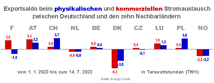 Die physikalischen Stromflüsse, die an den Kuppelstellen des deutschen Netzes mit den Nachbarländern registriert werden, entsprechen in ihrer Gesamtheit dem kommerziell vereinbarten Stromaustausch mit dem Ausland. Bei der Betrachtung einzelner Länder sind sie jedoch wenig aussagekräftig, weil der Strom oft andere Wege nimmt, um vom Lieferanten zum Empfänger zu gelangen.
