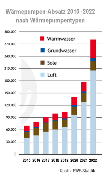 Die wenigsten Wärmepumpen nutzen das Grundwasser als Energielieferant (blau). Mit dem Boom der vergangenen Jahre ist aber auch ihr Absatz erheblich gestiegen. |