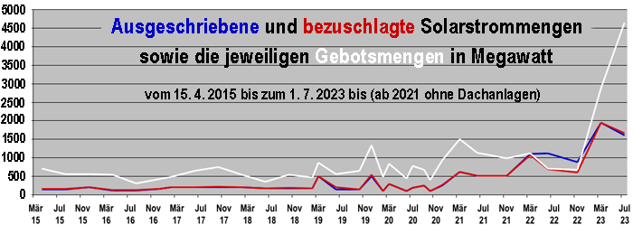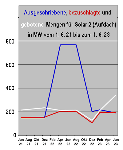 Die siebte separate Ausschreibung für Solaranlagen des "zweiten Segments", die zum 1. Juni stattfand, wurde erstmals wieder überzeichnet, nachdem bei den vier vorangegangen Ausschreibungen eine teilweise krasse Unterzeichnung festzustellen war. Das lag vor allem daran, dass die Bundesnetzagentur die für die drei Auktionen des Jahres 2022 vorgesehenen Mengen gut fünfmal höher angesetzt hatte als bei den beiden ersten Ausschreibungen (221212). Erst bei der fünften Auktion zum 1. Dezember wurde dieser Versuch, durch eine starke Ausweitung des Angebots eine entsprechende Nachfrage zu stimulieren, als sinnlos abgebrochen und die Ausschreibungsmenge wieder dem früheren Umfang angenähert.