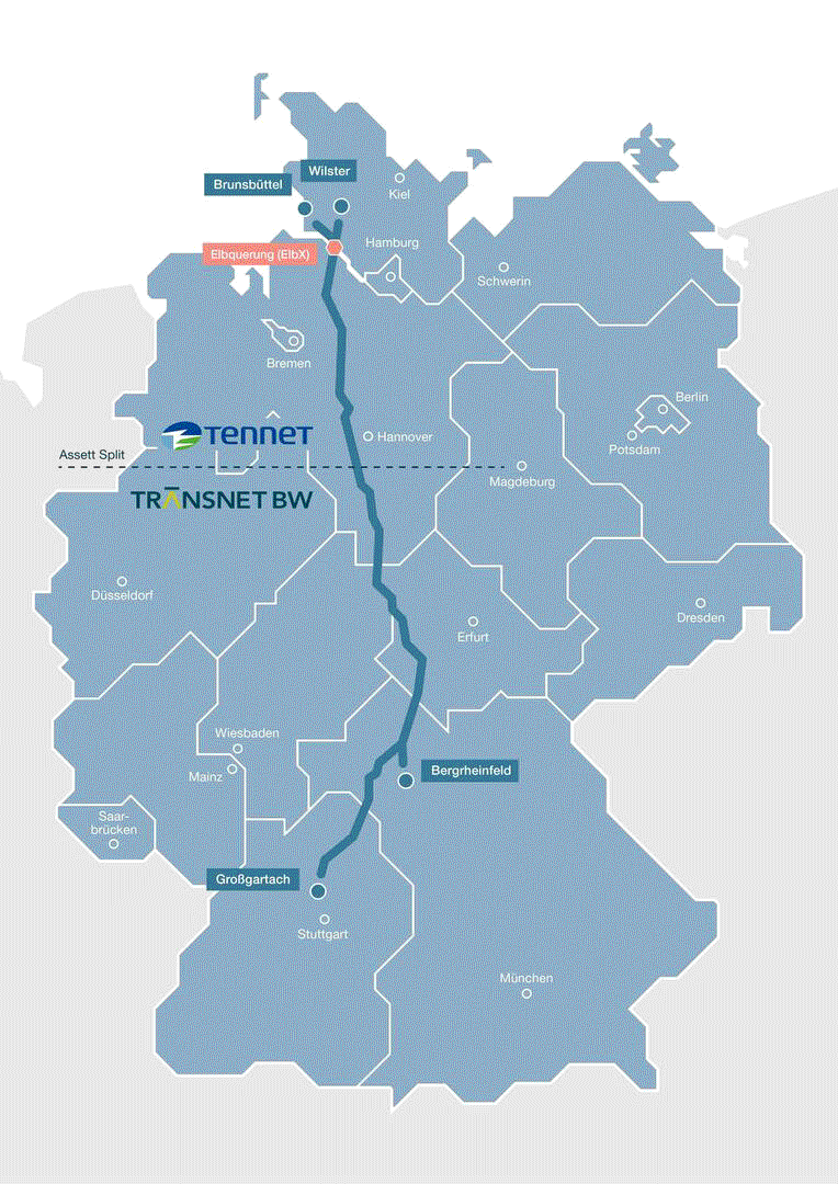Die beiden "SuedLink"-Leitungen können jeweils eine Leistung von zwei Gigawatt übertragen. Sie werden gemeinsam unter der Elbe hindurchgeführt. Dann verlaufen sie parallel nach Süddeutschland, wo die eine in Bayern und die andere in Baden-Württemberg endet. (Zurück) Grafik: TenneT