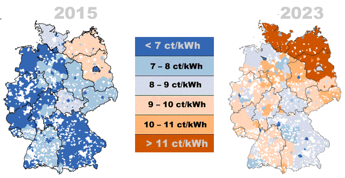 Die beiden Karten verdeutlichen die unterschiedliche Höhe der Netzentgelte in den rund 860 deutschen Verteilnetzen sowie deren Anstieg binnen acht Jahren. In der durchgehend braunen Fläche rechts oben liegen die Verteilnetze von WEMAG Netz, Schleswig-Holstein Netz und EDIS Netz. Diese würden am meisten von einer gleichmäßigeren Verteilung der auf die EE-Einspeisung entfallenden Kosten der Netzentgelte profitieren, wie sie jetzt die Bundesnetzagentur vorschlägt.
