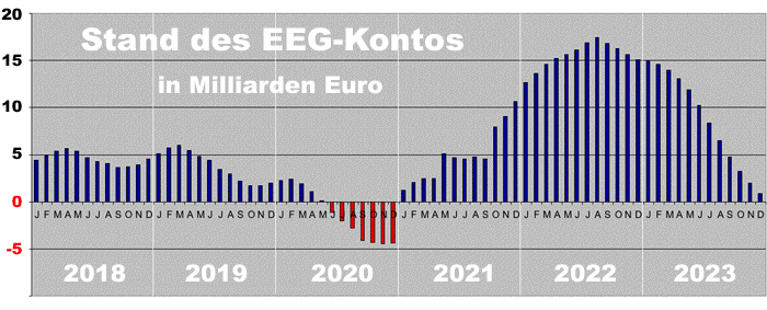 | Es geht abwärts: Zum Jahresende 2023 waren gerade noch 891 Millionen Euro auf dem EEG-Konto. – Ein Klacks im Vergleich zum bisherigen Höchststand im August 2022 mit gut 17,4 Milliarden. (Weitere Details zu dieser aktualisierten Grafik siehe 231102.) |