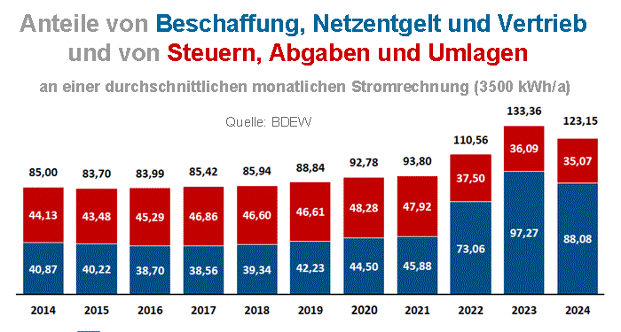 Nach wie vor sind die Strompreise aber gegenüber 2021 deutlich höher, obwohl sich ihre Belastung durch Steuern, Abgaben und Umlagen um gut ein Viertel verringert hat. In der Modellrechnung für den Drei-Personen-Haushalt wird der Rückgang der staatlichen Belastung um 12,85 Euro durch einen Anstieg der Kosten für Beschaffung, Netzentgelte und Vertrieb um 42,20 Euro bei weitem übertroffen. Gegenüber dem Stand vor drei Jahren sind deshalb die monatlichen Stromkosten des Durchschnittshaushalts um knapp 30 Euro oder 31 Prozent höher.