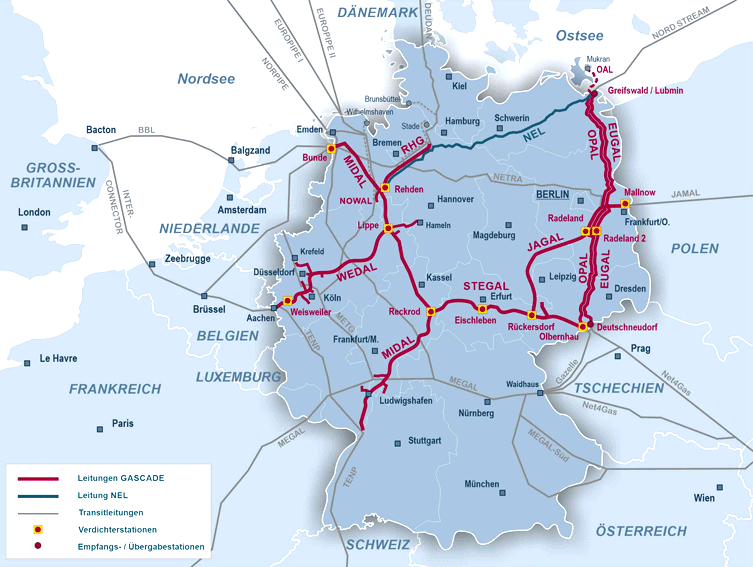 EUGAL und OPAL sowie die derzeit in Bau befindliche OAL von Rügen nach