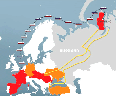 Wie der "Monitor"-Moderator Georg Restle feststellte, lassen diese Sanktionspakete "nicht nur jede Menge Schlupflöcher offen, sondern gleich riesige Scheunentore, durch die selbst solche Mammutfrachter mühelos hindurchpassen". Er meinte damit die LNG-Tankerflotte, die der Oligarch Gennadi Timtschenko betreibt, der einer der reichsten Männer Russlands und Mitglied der Putin-Clique ist, sowie die noch in Betrieb befindlichen Gaspipelines durch die Ukraine und das Schwarze Meer (siehe Karte).