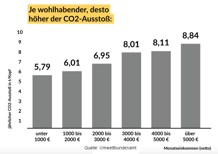 Mit dieser Grafik veranschaulicht der Verein "Sanktionsfrei", dass Einkommensschwache weniger als Gutverdienende zu CO2-Emissionen durch Sprit, Heizöl oder Gas beitragen, aber besonders hart von der CO2-Bepreisung betroffen werden. Deshalb sei vor allem für sie eine Kompensation in Form des "Klimagelds" nötig. |