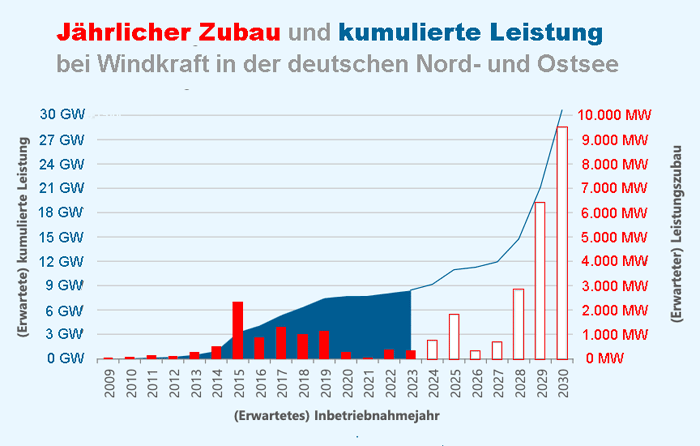 Die Energie Baden-Württemberg (EnBW) begann am 16. Mai mit dem Bau des Offshore-Windparks "He Dreiht" in der deutschen Nordsee. Er soll bis Jahresende 2025 mit einer Leistung von 960 MW in Betrieb gehen. Der Ausbau der Windkraft vor der deutschen Küste, der in den letzten Jahren weitgehend zum Erliegen kam, nimmt damit allmählich wieder Fahrt auf. In diesem Jahr ist die Inbetriebnahme der Windparks "Baltic Eagle" (476 MW) und Gode Wind 3 (242 MW) geplant. Im kommenden Jahr ist mit der Fertigstellung des Windparks Borkum Riffgrund 3 (900 MW) zu rechnen. Zusammen mit "He Dreiht" ergäbe das einen Zubau von 1.860 MW, wie er seit 2015 nicht mehr erreicht wurde. Es werden jedoch noch weit größere Zubaumengen erforderlich sein, um die kumulierte Nennleistung von 30 Gigawatt zu erreichen, die gemäß dem im Juli 2022 beschlossenen Windenergie-auf-See-Gesetz (220703) bis 2030 als Ziel vorgegeben sind (siehe Grafik).