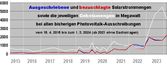 Nach Beginn der Ausschreibungen war die Photovoltaik-Nachfrage (weiß) sieben Jahre lang regelmäßig höher als das Angebot (blau). Die Kurve der bezuschlagten Strommengen (rot) deckte sich deshalb bis ins Frühjahr 2022 fast genau mit der blauen Angebotskurve. Das änderte sich jedoch 2022: Weil die Nachfrage dem stark erhöhten Photovoltaik-Angebot plötzlich nicht mehr zu folgen vermochte, blieben zwei Auktionen deutlich unterzeichnet. Nachdem dann der wunde Punkt erkannt und durch eine EEG-Änderung behoben worden war, ging die Gebotskurve fast durch die Decke. – Die Zahlen zu dieser Grafik sowie weitere Angaben sind der Tabelle zum Photovoltaik-Segment 1 zu entnehmen. |
