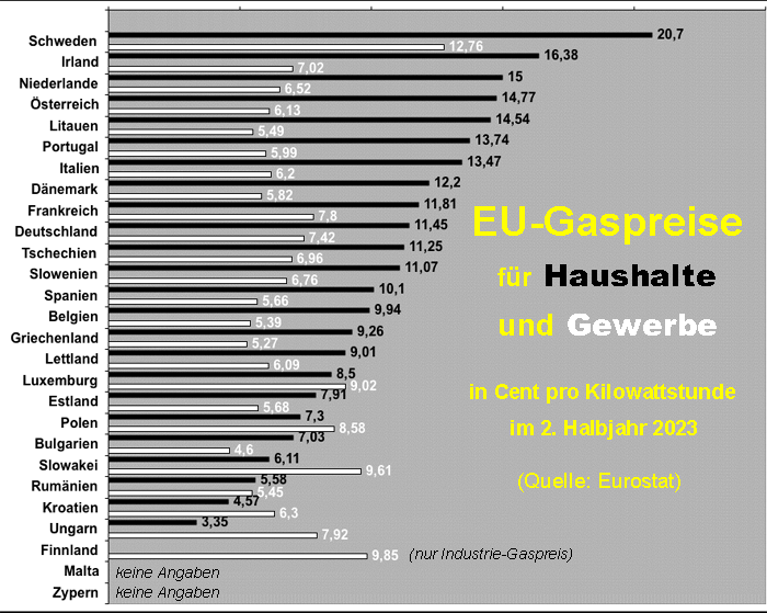 Ungarn hat nicht ganz zufällig die niedrigsten Haushalts-Gaspreise in der EU: Zum einen liegt das an den besonders günstigen Lieferkonditionen, mit denen der Kreml dem Orban-Regime dessen Unterstützung für Putin honoriert. Zusätzlich werden die Gaspreise für Kleinverbraucher von der Regierung zu Lasten des industriellen Sektors subventioniert, um ihr die Unterstützung in der Bevölkerung zu sichern. Dadurch sind sie weniger als halb so hoch wie die Preise, welche die Industrie und andere gewerbliche Verbraucher zahlen müssen. – Ganz anders ist jedoch die Lage in Österreich, das seinen Gasbedarf in ähnlicher Weise wie Ungarn größtenteils von der Gazprom bezieht: Hier verlangt Gazprom die üblichen Marktpreise. Die Kilowattstunde kostet deshalb für Haushaltskunden mehr als viermal soviel wie in Ungarn, während die Industriestrompreise geringer sind. |
