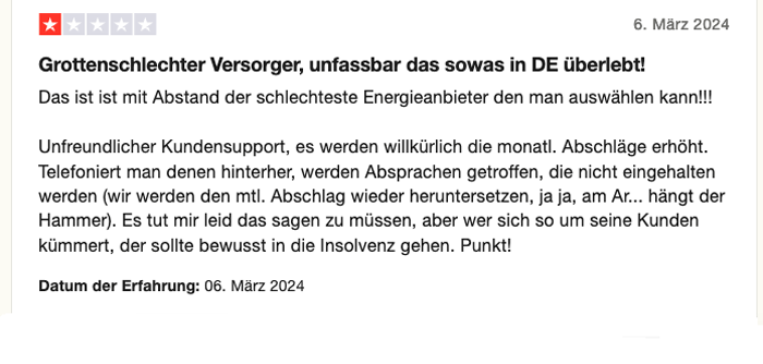 Seit 2022 häuften sich die Beschwerden über den Online-Energieanbieter "stadtenergie". Die hier gezeigten Klagen, die das Internet-Beschwerdeportal "Trustpilot" veröffentlichte, sind nur eine kleine Auswahl aus den neueren Einträgen. Die Kunden empörten sich besonders über die Dreistigkeit, mit der die DEW21-Tochter ihre berechtigte Kritik einfach ignorierte. Viele konnten sich das nur so erklären, dass sie zum Opfer einer "Abzocke" durch "Betrüger" und "Kriminelle" geworden seien – womit sie gar nicht so falsch lagen, wie sich jetzt herausstellte. |