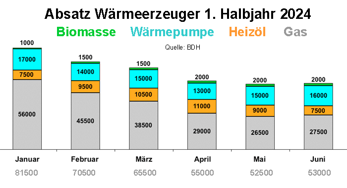 Besonders stark war der Rückgang bei den Gasheizungen, der von Januar bis Juni gut fünfzig Prozent betrug. Die Nachfrage bei Ölheizungen erreichte im April einen Höhepunkt, um sich dann wieder auf dem Stand vom Januar einzupendeln. Bei Wärmepumpen war die Entwicklung gegenläufig: Hier ging der Verkauf bis April kontinuierlich zurück, lag dann aber im Juni nicht mehr weit unter dem Stand von Anfang des Jahres. Biomasse-Heizungen erreichten wie bisher nur kleine Stückzahlen. Im Vergleich zum Vorjahr waren diese insgesamt noch geringer, haben sich jedoch innerhalb des ersten Halbjahrs verdoppelt.