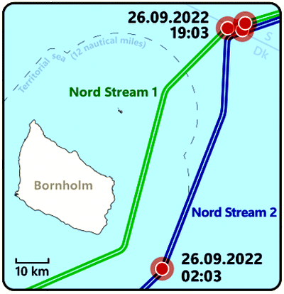 Am 26. September 2022 um 2.03 Uhr zerstörte südöstlich von Bornholm eine Explosion zunächst den Strang A der neuen – noch nicht in Betrieb genommenen - Pipeline Nord Stream 2. Exakt sieben Stunden später folgten in etwa 80 Kilometer Entfernung, wo die Ausschließlichen Wirtschaftszonen von Dänemark und Schweden aufeinander treffen, drei weitere Explosionen. Diese unterbrachen auch beide Stränge von Nord Stream 1 und fügten dem Strang A von Nord Stream 2 ein weiteres Loch hinzu. Grafik: Wikipedia