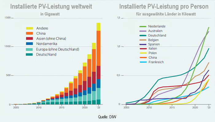 Der Ausbau der Photovoltaik in Deutschland liegt derzeit über dem von der Bundesregierung angestrebten Wachstumspfad. Mit knapp 91 Gigawatt an installierter Nennleistung übertraf er schon Ende Juli das in § 4 des Erneuerbare-Energien-Gesetzes für das gesamte Jahr 2024 festgelegte Ziel von 88 Gigawatt. Das aktuelle Zubau-Tempo müsste aber trotzdem noch schneller werden, um das Ausbauziel von 215 Gigawatt im Jahr 2030 zu erreichen. Dies ergibt sich aus dem "Ampel-Monitor Energiewende", den das Deutsche Institut für Wirtschaftsforschung (DIW) Mitte August in seinem Wochenbericht 33/2024 veröffentlichte (PDF).