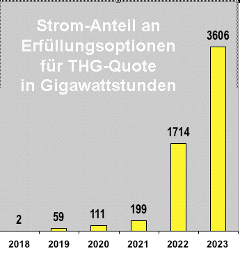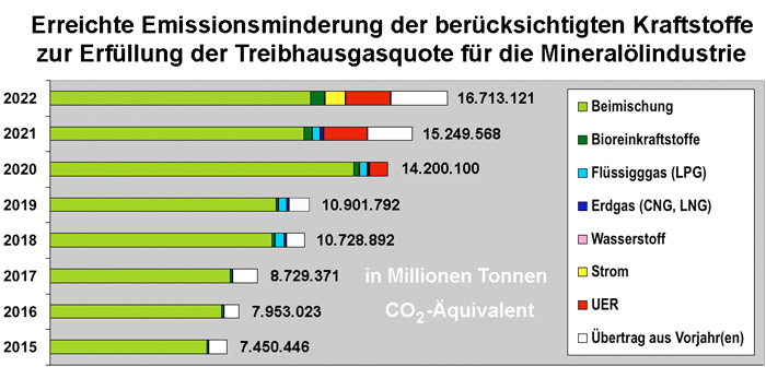 Dazu beigetragen hat neben den UER-Zertifikaten, die seit 2020 für meistens sehr fragwürdige CO2-Einsparungen bei der Ölförderung ausgestellt wurden, auch die Honorierung von Strom für den Antrieb von Fahrzeugen anstelle von Benzin oder Diesel. Im Prinzip konnten dafür schon seit 2018 Gutschriften erteilt werden. Größere Bedeutung erlangten diese Gutschriften für den Ersatz von fossilen Kraftstoffen durch Strom aber erst mit dem 2021 beschlossenen Gesetz zur Weiterentwicklung der Treibhausgasminderungsquote. Dieses Gesetz, das die bis dahin geltende THG-Quote von 6 Prozent bis zum Jahr 2030 stufenweise auf 25 Prozent erhöht, ermöglichte es erstmals auch den privaten Besitzern von Elektroautos, am Quotenhandel teilzunehmen. Zusammen mit der aus dem Vorjahr übertragenen Übererfüllung der Minderungsverpflichtung konnte die Mineralölindustrie so für das Jahr 2022 insgesamt eine Emissionsminderung um 16.713.121 Millionen Tonnen CO2-Äquivalent geltend machen.