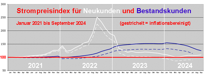 Bei seinem Start im September lag der neue Strompreis-Index für Neukunden bei 109,2 und für Bestandskunden bei 124,5 Prozentpunkten. Inflationsbereinigt (gestrichelte Linien bis Juli) war er deutlich niedriger und betrug zuletzt 90,17 bzw. 114,09 Prozentpunkte. Bei Berücksichtigung der Geldentwertung war der Strom für Neukunden demnach billiger als im Bezugsmonat Januar 2021, und das schon seit Oktober 2023. Daten: smard / Grafik: EC