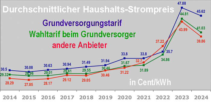 Die Grafik lässt ferner die Verwerfungen des Preisgefüges erkennen, die ab 2021 durch den immer rasanteren Anstieg der Großhandelspreise entstanden: Nun funktionierte das Geschäftsmodell der Billiganbieter nicht mehr, die besonders stark vom Spotmarkt abhängig waren. Ihre Angebote wurden deshalb noch ungünstiger als die Preise der Grundversorgung. Aber auch bei den anderen Stromvertrieben explodierten die Beschaffungskosten. Ab Januar 2023 wurde deshalb die staatlich subventionierte "Strompreisbremse" eingeführt, die den Strompreis für 80 Prozent des bisherigen Verbrauchs auf 40 Cent/kWh begrenzte (221101, 221201). Ursprünglich war diese milliardenschwere Subventionierung bis Ende April 2024 vorgesehen. Sie wurde indessen nach zwölf Monaten wieder aufgehoben, nachdem sich die außer Rand und Band geratenen Großhandelspreise wieder rückläufig entwickelten. Schon Anfang 2023 warben einige "Discounter" mit Angeboten, die zumindest optisch knapp unterhalb der Strompreisbremse lagen (230101). Das allgemeine Preisniveau für Haushaltsstrom blieb jedoch weiterhin über dieser Grenze und lag noch Anfang 2024 bei durchschnittlich 42,22 Cent/kWh (240206). Dies lassen auch die drei Angaben zum Stichtag 1. April 2024 erkennen, mit denen diese grafische Darstellung der Preisentwicklung endet. |