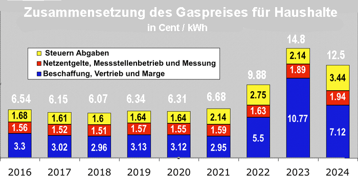 Aktuell liegt der Anteil der Netzentgelte einschließlich Messung bei ungefähr 15,5 Prozent des durchschnittlichen Gaspreises für Haushalte. Die Verkürzung der Abschreibungsfristen wird sich naturgemäß erhöhend auswirken. Laut einer Studie von "Agora Energiewende" wären diese Erhöhungen aber noch weitaus stärker und viel ungleicher verteilt, wenn die nun eingeleitete Anpassung des Ordnungsrahmens an das für 2045 geplante Klimaziel nicht erfolgen würde. Quelle: smard.de