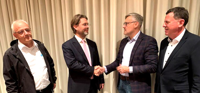 Dem neuen Stadtwerke-Geschäftsführer Falk-Wilhelm Schulz (2. v. l.) fällt nun die Aufgabe zu, das beschlossene Sanierungskonzept umzusetzen. Unterstützt wird er dabei von Bürgermeister Marcus Ehm als Vorsitzender des Aufsichtsrats, dem er gerade die Hand reicht, dessen Stellvertreter Manfred Storrer (rechts) sowie dem stellvertretenden Aufsichtsratsvorsitzenden Anton Fetscher (links). Foto: Stadtverwaltung |