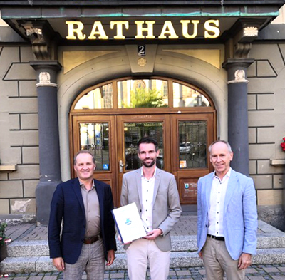 Die Badenova erwarb 2023 nicht nur eine Sperrminorität an den Stadtwerken Titisee-Neustadt, sondern bekam auch für weitere zwanzig Jahre die Konzession für den Betrieb des städtischen Gasnetzes. Auf diesem Foto präsentieren der Bürgermeister Gerrit Reeker (Mitte) und zwei Badenova-Vertreter den neuen Vertrag. Foto: Badenova