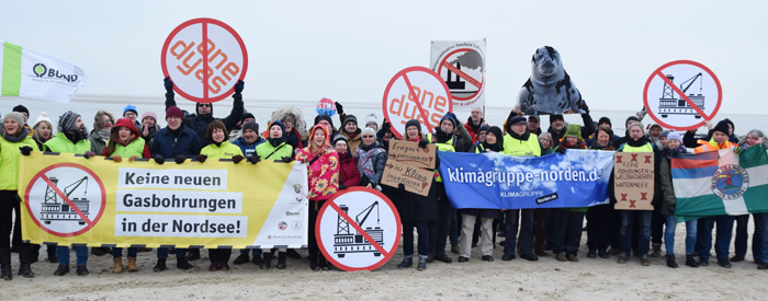 Anfang 2023 demonstrierte ein breites niederländisch-deutsches Umweltbündnis am Strand von Borkum gegen neue Gasbohrungen in der Nordsee. Foto: DUH |