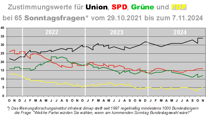 | Der Hauptgrund für den Niedergang und das schließliche Zerbrechen der Ampel war, dass die FDP (gelbe Kurve) schon zwölf Monate nach Regierungsantritt bei der "Sonntagsfrage" bis auf fünf Prozent absackte. In panischer Angst, bei der regulären Neuwahl im September 2025 erneut aus dem Bundestag verbannt zu werden, versuchte deshalb der Parteichef Lindner, den Wählerkreis der Partei rechts von SPD und Grünen durch einen permanenten Zwist mit den beiden Koalitionspartnern zu erweitern. Dort ackerte indessen die Union (schwarze Kurve) erfolgreicher, während die FDP gerade wegen ihrer Behinderung einer gemeinsam erfolgreichen Regierungspolitik zum Schluss fast dauerhaft unter fünf Prozent lag. (Siehe Hintergrund) |