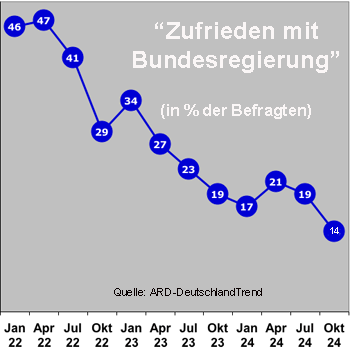 Die vom "DeutschlandTrend" der ARD vierteljährlich ermittelte Zufriedenheit der Bundesbürger mit der jeweiligen Regierung erreichte im April 2022 mit 47 Prozent ihren Höhepunkt. Kurz vor dem endgültigen Bruch der Ampel waren es nur noch 14 Prozent. |