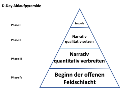 Mit einem "D-Day"-Papier bereitete die FDP seit Oktober 2024 generalstabsmäßig einen von ihr provozierten Bruch der Ampel vor, dem dann allerdings der Bundeskanzler mit dem Rauswurf Lindners aus dem Kabinett zuvorkam. Das Papier wurde laufend aktualisiert. Diese Grafik entstammt der letzten Fassung, die unter dem Druck der Enthüllungen von der FDP selber veröffentlicht wurde, um der Publizierung älterer Versionen zuvorzukommen. Sie zeigt in vier Phasen, wie der Bruch der Koalition zunächst propagandistisch begründet und das gefundene "Narrativ" über wichtige Medien-Kontakte wie zu "Bild" verbreitet werden sollte, bevor die "offene Feldschlacht" mit SPD und Grünen beginnen würde. In älteren Versionen des Papiers steht an der Spitze der Pyramide nicht das Wort "Impuls", sondern "Zündung". |