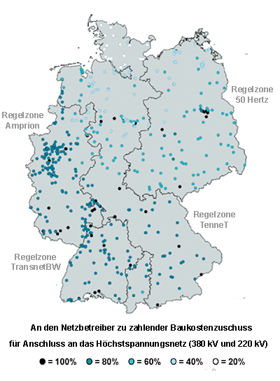 Im Norden Deutschlands gibt es die meisten Standorte mit stark reduzierten Baukostenzuschüssen für den Anschluss an das Übertragungsnetz. (Vergrößern) Quelle: Übertragungsnetzbetreiber |