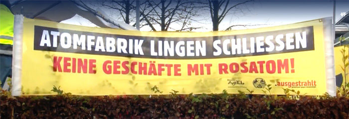 Mit einem großen Transparent vor dem Gebäude, in dem die atomrechtliche Anhörung stattfand, verlangte die Initiative "Ausgestrahlt" die Verhinderung der Beteiligung des russischen Atomkonzerns an der Brennelemente-Herstellung in Lingen sowie die Schließung der "Atomfabrik". |