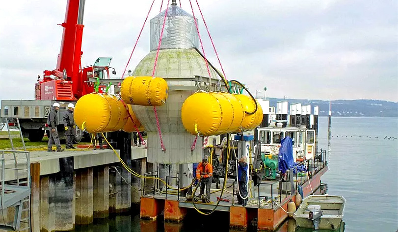 Das Fraunhofer-Institut für Energiewirtschaft und Energiesystemtechnik IEE hat einen Unterwasser-Energiespeicher entwickelt, der das Prinzip der Pumpspeicher-Kraftwerke auf den Meeresgrund überträgt. Nach erfolgreichem Feldtest mit einem kleineren Modell im Bodensee bereiten die Forscher nun mit Partnern einen Testlauf vor der kalifornischen Küste vor: Sie werden dort im Projekt "StEnSea" in 500 bis 600 Metern Tiefe eine hohle, 400 Tonnen schwere Betonkugel mit neun Metern Durchmesser verankern. Durch Leerpumpen wird der Speicher geladen. Strömt Wasser hinein, wird er entladen und Strom erzeugt. Die Leistung dieses Prototypen beträgt 0,5 Megawatt, die Kapazität 0,4 Megawattstunden.