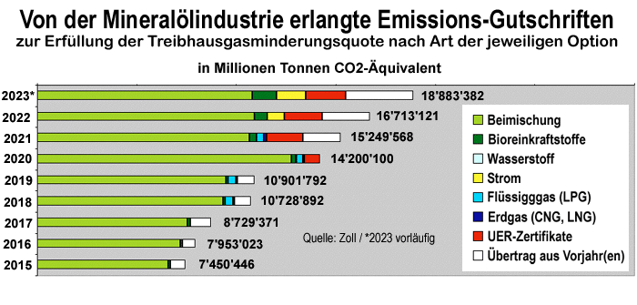 Die rechnerisch erzielten CO2-Minderungen, die auf Gutschriften für Biokraftstoffe (grün) und UER-Zertifikaten (rot) beruhen, stehen großteils auf schwachen Füßen. Am solidesten wirken noch die Gutschriften für Elektromobilität (gelb), die 2023 weiter zugenommen haben. |