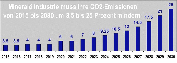 Mit einer Novellierung des Bundesimmissionsschutzgesetzes wurde 2015 die Mineralölindustrie verpflichtet, die durch Benzin und Diesel verursachten CO2-Emissionen bis 2030 stufenweise um 25 Prozent zu senken oder eine entsprechende "Ausgleichsabgabe" zu zahlen. Zugleich wurde es ihr ermöglicht, diese CO2-Minderungsverpflichtungen durch den Erwerb von Gutschriften für die Verwendung von Bio-Kraftstoffen, Elektrofahrzeugen oder anderen CO2-Einsparungen zu erfüllen. Inzwischen soll diese THG-Quotenregelung in ein zweites EU-Emissionshandelssystem (ETS 2) für Gebäude, Verkehr und andere Sektoren einbezogen werden, das ab 2027 startet und den seit 2005 bestehenden Emissionshandel für Kraftwerke und andere Großfeuerungsanlagen (ETS 1) ergänzt. Miteinbezogen wird dabei auch die seit 2021 erhobene CO2-Abgabe auf Benzin, Diesel, Heizöl und Erdgas, die mit dem Brennstoffemissionshandelsgesetz (191103) eingeführt wurde. |