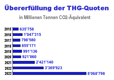 Die in Deutschland tätigen Mineralölkonzerne haben auch 2023 spielend die gesetzliche THG-Quote erfüllt, die ihnen im vergangenen Jahr eine Minderung der von ihnen verursachten CO2-Emissionen um 8 Prozent abverlangte (siehe Grafik 2). Das ergibt sich aus vorläufigen Angaben des Hauptzollamts Frankfurt (Oder), das die Daten zur Erfüllung der THG-Quote erfasst. Die mit dem Verkauf von Benzin und Diesel zwangsläufig verbundenen CO2-Emissionen konnten die Unternehmen komplett durch Beimischung von Biokraftstoffen sowie andere "Erfüllungsoptionen" kompensieren, die in § 37a Absatz 5 des Bundesimmissionsschutzgesetzes vorgesehen sind. Und nicht nur das: Mit einer rechnerisch erreichten Emissionsminderung von 18.883.382 Tonnen CO2-Äquivalent übertrafen sie die Gesamtverpflichtung der Branche um 8.068.798 Tonnen oder 43 Prozent. Außerdem hat die Mineralölindustrie zum ersten Mal die von Jahr zu Jahr steigende THG-Quote komplett durch Nutzung der zugelassenen Kompensationsmöglichkeiten erfüllt und deshalb keinen Cent "Ausgleichsabgabe" zahlen müssen, wie das im Vorjahr mit insgesamt 31,5 Millionen Euro noch der Fall war.