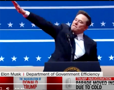 Bei der Jubelveranstaltung zur Amtseinführung Trumps tanzte Musk zunächst wie ein Kind freudentrunken über die Bühne. Dann dankte er dem Publikum, dass es diesen Sieg möglich gemacht habe. Dabei schlug er sich mit der rechten Hand auf die Brust, um anschließend durch Hochreißen des rechten Arms mit ausgestreckter Handfläche und verzücktem Gesicht den "Hitlergruß" zu vollführen. Und zwar gleich zweimal: Erst nach vorn zum Publikum, und dann nach hinten.